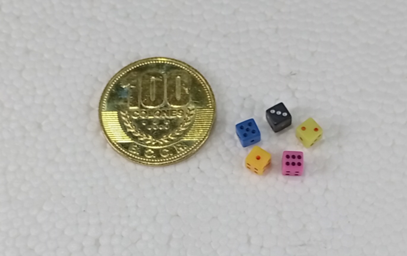 Nuevos, medida aproximada 5 milímetros por lado, lote de 5 dados con color variado